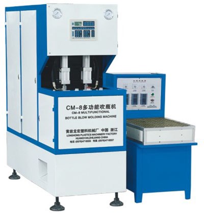 Multifunctional stretch blow molding machine which composed with one blower and one insert type heater, can make various kind of PET water drink bottle in volume of 2000ml.