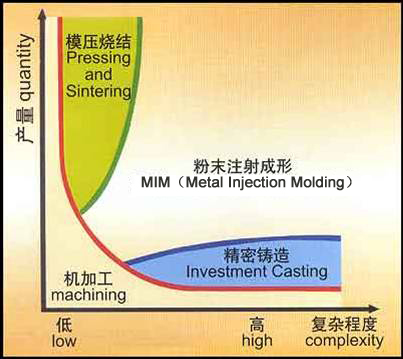 The Precision of Machining Process is far superior than other processing methods, but some parts can be made with machining due to its low effective utilization rate of material and shape limitation to equipment and tools. On the contrary, MIM can effectively utilize the material, not limited to shapes. In the manufacturing of small precision parts with difficult shapes, MIM is with relatively low cost, high efficiency and strong competiveness compared to machining processing. MIM technology makes up the technical insufficiency and unachievable regrets of traditional processing methods, but not competing with traditional processing methods. MIM technology can give full play of its strengths in parts that can��t be made with traditional processing methods.