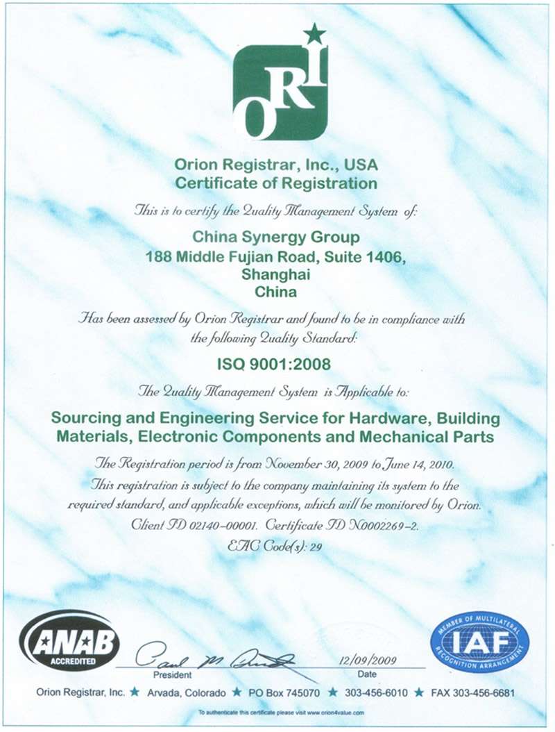 Achieving ISO 9000 is just a start and serves as foundation for conituous process improvement. At China Synergy Group, we have installed process management for all key operations for consistency, traceability, speed, accuracy and control. We provide weekly trainings (case studies) to all our purchasing staff to reinforce quality mentality and share experiences. These efforts ultimately benefit our customers with better product quality and service.